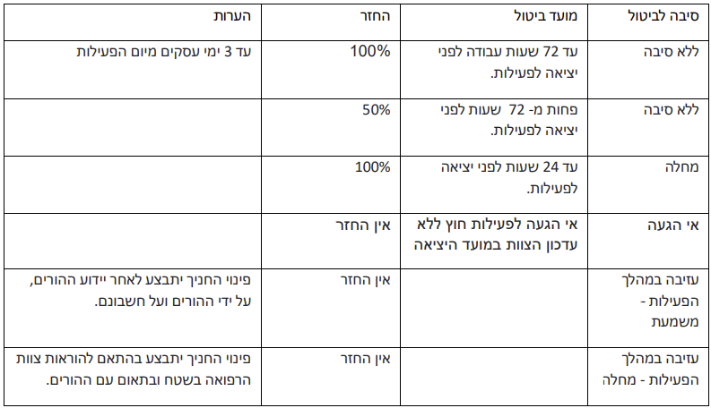 ● הנוהל מתייחס לפעילויות החינוך החברתי בקיבוץ בלבד )ולא לפעילות מועצתית ( . ● הרשמות לפעילויות מתבצעות על ידי הקישורים המצורפים לפרסומים ועד מועד סיומם. ● במהלך תהליך ההרשמה ימולא אישור ההורים אשר יהווה תנאי להגעת הנרשם לפעילות. ● לא תתאפשר הרשמה אחרי תאריך סיום ההרשמה. ביטול הרשמה: